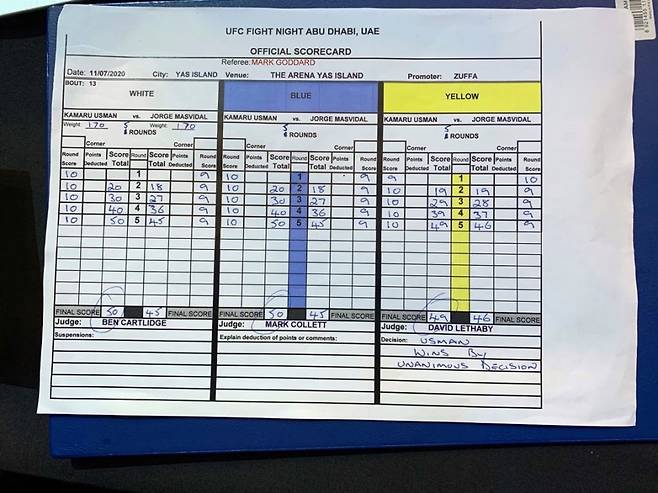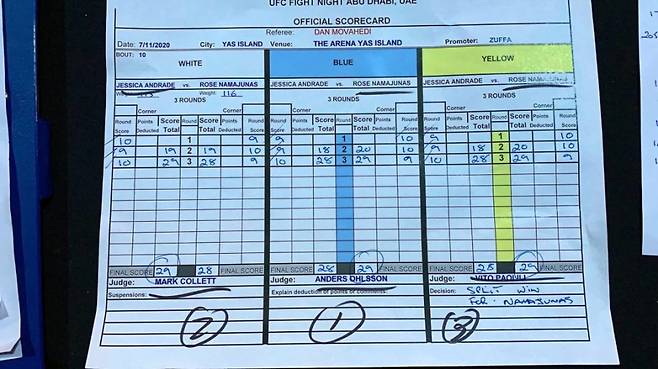 전 UFC 심판으로 현재 벨라토르 해설을 맡고 있는 존 맥카시는 트위터에서 "마크 콜렛(Mark Collet)을 잘라야 한다"고 강하게 비판했다. 콜렛은 UFC 251에서 제시카 안드라지에게 29-28 채점을, 알렉산더 볼카노프스키에게 48-47 채점을 한 저지(judge)다. (트위터)