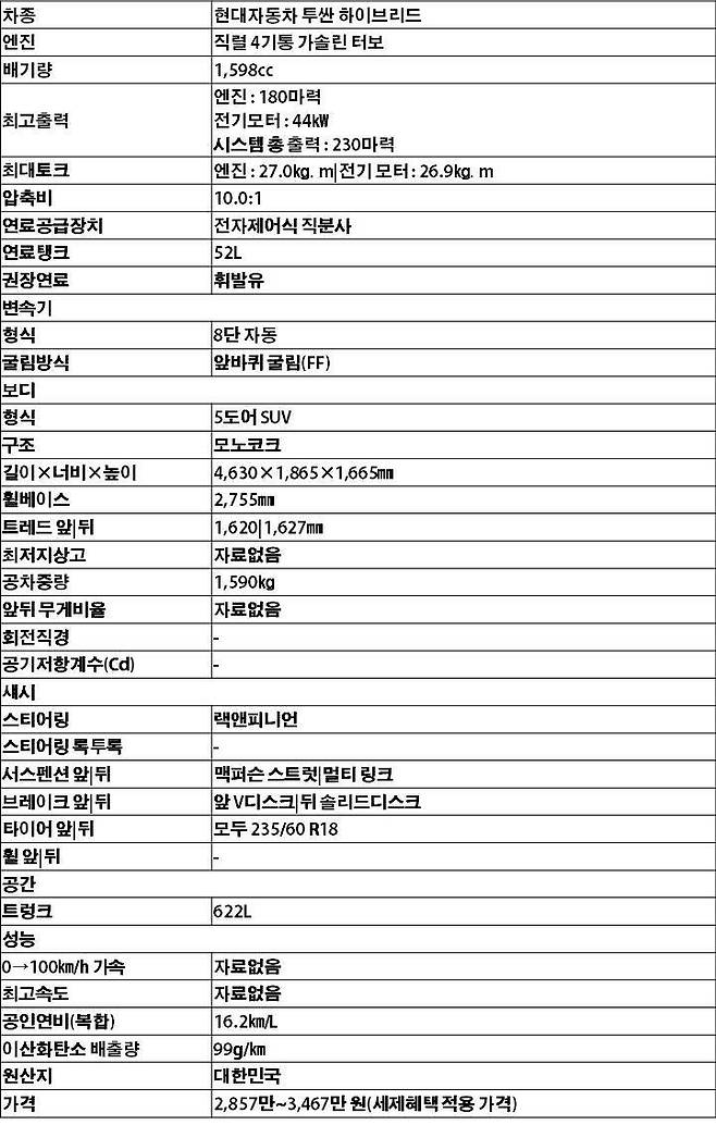 투싼 하이브리드의 보닛은 직렬 4기통 1.6L 가솔린 스마트스트림 터보 엔진을 품었다. 여기에 44.2㎾ 전기 모터와 6단 자동기어, 배터리를 엮었다. 쏘렌토 하이브리드와 같은 시스템 최고출력 230마력을 뿜는다. ‘형님’보다 작고 가벼운 차체에 힘입어 친환경차 세제 혜택도 받는다. 단, 정부공인 복합연비는 1L당 16.2㎞로 엄청난 효율을 기대했다면 다소 실망할 수 있다.