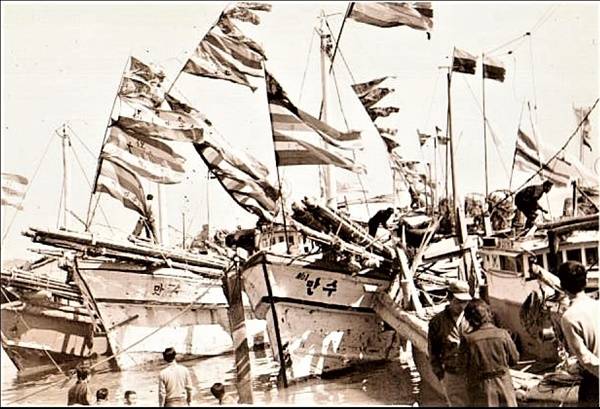| ▲ 1960년대 째보선창 선창에 정박한 어선들이 휘날리는 오색깃발의 모습에서 한때 번성했던 포구 모습을 회상할 수 있다. 물길이 뭍으로 길게 파고든 곳에 포구가 있었다. 지금은 복개되어 옛 모습을 찾을 수가 없다. |