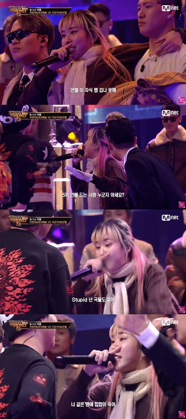 앞서 미란이는 지난 11월 27일 방송된 '쇼머더머니9'에서 래퍼 언텔과 디스전을 펼쳤다. 당시 미란이는 "언텔 이 자식 랩 겁나 못해" "대한민국 최악 래퍼 5위 안에 드는 사람 누군지 아세요?" "넌 국물도 없어. 탈락할 차례라고 빨리 숙여" "너 같은 애들 때문에 힙합이 죽어" 등의 가사를 사용했다.