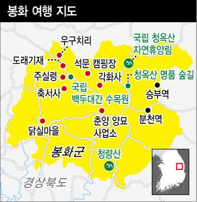 경북 봉화는 타고났다. 천혜의 환경이란 이럴 때 쓰는 말이다. 백두대간과 낙동정맥이 봉화를 지난다. 태백산(남쪽), 구룡산, 옥석산이 봉화에 있다. 태백 황지에서 발원한 낙동강은 봉화로 흐른다. 하지만 빼어난 자연환경에도 사람 발길은 드물다. 강원도 산간지역, 지리산 일대에 견줘 여행지로서 별로 주목받지 못했다. 그 탓에 교통과 숙박 등 시설은 부족하지만, 그 덕에 청정 자연은 풍부하다. 지난 8일 춘양면 우구치리를 걷다가 깊은 생각에 빠졌다. ‘이 신선한 공기를 어떤 말로 설명할 수 있을까?’ 봉화엔 그 공기만큼이나 꽤 신선한 여행지들이 있다. ‘아기 소나무 숲’, ‘공부하는 절’, ‘백두대간 전망 카페’, ’공기 좋은 옛 금광 촌’, ‘전망 좋은 장수마을’ 등이다. 가는 곳마다 충분히 한적했기에 신선함을 음미할 수 있었는지도 모르겠다.