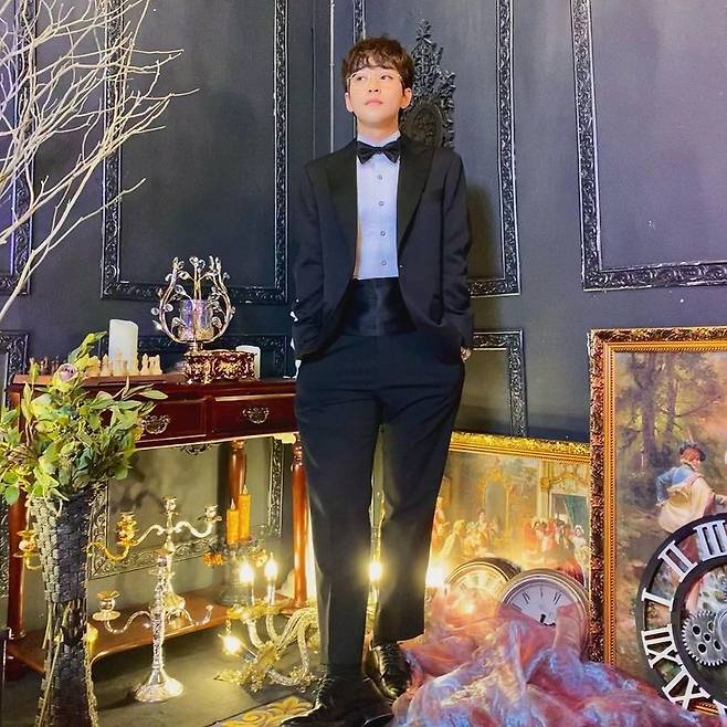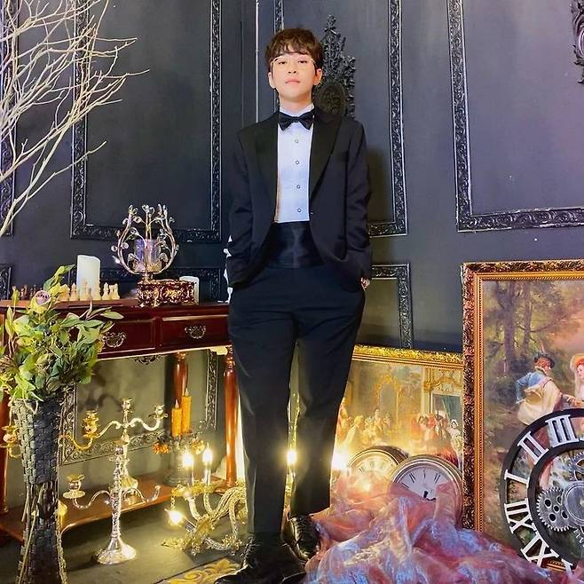공개된 사진에서 딘딘은 시계, 촛대 등 화려한 장식을 배경으로 슈트를 입은 채 서 있다.