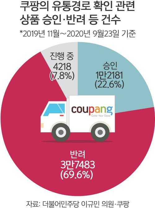 이 의원을 통해 확보한 자료에 따르면 지난해 11월부터 지난달(9월23일 기준)까지 반려된 건수는 3만7483건에 달한다. 반면 같은 기간 승인된 건수는 1만1281건으로 절반에도 못 미친다. 쿠팡의 허락을 받지 못하는 동안 소상공인들은 매출에 직격탄을 맞는 셈이다. 쿠팡에 입점한 중소상공인들은 쿠팡이 애초 계약내용에 포함돼 있지 않은 유통경로 소명을 요구하고 있다고 주장했다.