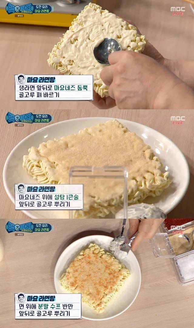 다음은 라면을 이용한 디저트, 마요 라면땅을 만들 차례였다. 준비물은 라면과 마요네즈. 백종원은 아주 쉬운 방법을 알려주겠다며 "라면에 마요네즈를 짜 숟가락으로 잘 펴바르라. 그다음 설탕을 위에만 솔솔 뿌려주라. 설탕은 많이 뿌릴수록 맛있으니 양심껏 뿌리라. 다음으론 라면수프 반만 양면에 뿌려줘야 한다. 많이 뿌리면 짜다"고 알려줬다. 이 과정은 다른 쪽 면에도 반복해주면 됐다. 백종원은 "저는 라면 수프 1/4정도밖에 안 썼다"고 강조했다. 이후 전자레인지에 2분 50초을 돌리거나 에어프라이어에 180도로 5분 돌려주면 됐다.