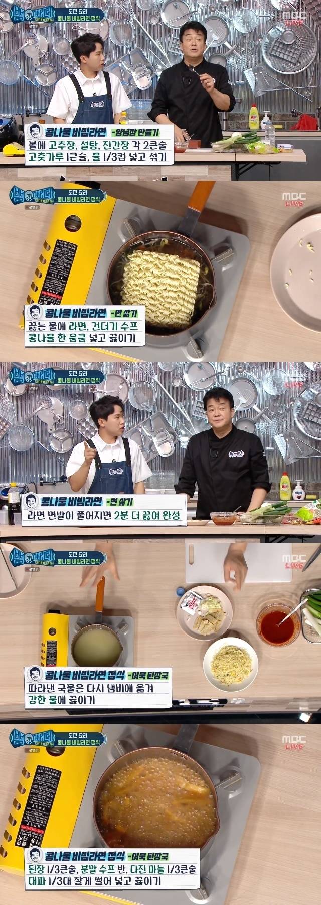 배워볼 메뉴 이름은 콩나물 비빔라면 정식. 백종원은 가장 중요한 양념장부터 만들어 보겠다고 했다. 양념장에는 고추장 듬뿍 2숟가락, 설탕 듬뿍 2숟가락, 진간장 2숟가락, 고춧가루 1숟가락, 물 종이컵 1/3컵이 들어갔다. 백종원은 "이건 다용도로 쓸 수 있는 비빔양념장이가도 하다. 요리 잘하시는 분들은 여기에 다진마늘도 넣고 하는데 다진마늘, 파를 넣으면 오래 보관이 안 된다. 이렇게만 만들면 두고두고 써도 된다"고 말했다. 백종원은 "찍어 먹어서 달다 싶으면 된 것"이라고도 알려줬다.