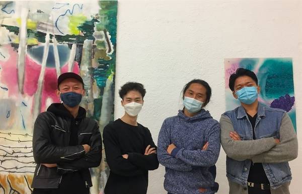 | ▲ 독일 뮌헨 한인작가 단체전 <수중에서 구름속으로>에 참가했던 작가들 이영준 작가의 회화 <개들의 행진>을 배경으로, 단체전에 참가했던 작가들이 전시 오프닝에서 포즈를 취하고 있다. 왼쪽부터 이영준, 임종훈, 신봉철, 이재민 작가의 모습이 보인다. 10월 2일부터 9일간 뮌헨의 도마크아틀리에(Domagkateliers)에서 열린 이 전시회는 독일의 저명한 슈테파니 슈타비 큐레이터가 기획했고 뮌헨시의 재정지원으로 성사됐다. |