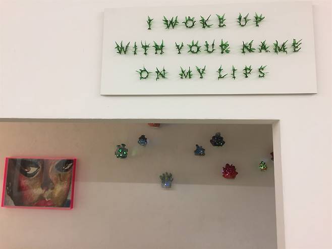 | ▲ 이재민 작가의 '바비시리즈' '멍게시리즈'와 신봉철 작가의 'Broken Glass Letters' 시리즈 신봉철 작가의 'I Woke Up With Your Name On My Lips'는 'Broken Glass Letters'시리즈 중 하나다. 작가 노트: "우리는 사랑이라는 이름으로 서로에게 상처를 주고, 구속하고, 피흘리게 하지요. 사랑은 내가 어떤 사람인지 가장 분명하게 보여주는 거울같아요. 내가 얼마나 모순적이고 비겁하고 이기적이고 불완전한지 다 들통나서 아 내가 이런 사람이었구나 하고 알아차리는 순간은 정말 끔찍하죠. 이런 선물같은 순간들 때문에 사랑이 아름다운거같아요." |