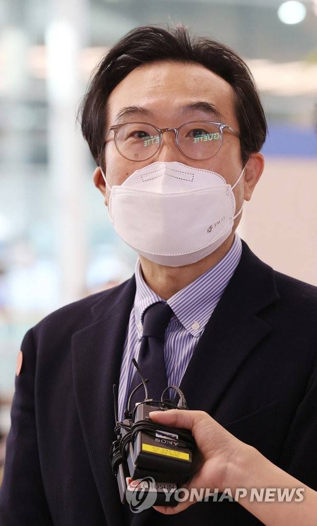 (영종도=연합뉴스) 이지은 기자 = 이도훈 외교부 한반도평화교섭본부장이 방미 일정을 마친 뒤 1일 오후 인천국제공항을 통해 귀국한 뒤 취재진 질문에 답하고 있다. 이 본부장은 지난 28일 스티븐 비건 국무부 부장관 겸 대북특별대표와 회담했다. 2020.10.1