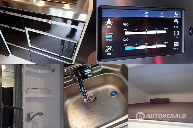 또한 태양광을 전기로 바꿔 주는 태양전지 패널도 사양으로 선택할 수 있으며 대용량 배터리 및 효율적인 충전시스템을 적용해 캠핑 중 배터리 방전에 대한 걱정을 줄였다. 이밖에 편의 장비로는 냉난방기, 냉장고, 싱크대, 전자레인지와 같은 사양을 제공하고 다양한 캠핑카 기능은 뒤쪽 메인 도어 안쪽에 위치한 직관적인 터치식 통합 컨트롤러로 제어 가능하다. 블루투스 연결을 통해 스마트폰으로도 작동할 수 있는 부분도 눈에 띈다.