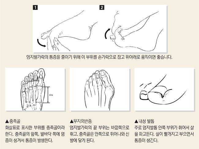 엄지발가락의 통증을 줄이기 위해 오른쪽 그림처럼 엄지발가락을 손가락으로 잡고 위아래로 움직이면 좋습니다.