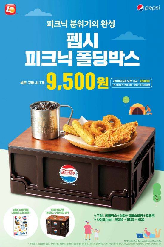 폴딩박스의 뜨거운 인기에 롯데리아도 휴대가 간편한 나들이용 ‘펩시 피크닉 폴딩박스’를 선보였다. 펩시 피크닉 폴딩박스는 가로 34㎝, 세로 25㎝, 높이 13㎝ 규격의 접이식 피크닉 박스로 나만의 디자인이 가능한 포인트 스티커와 간편히 휴대할 수 있도록 포장백에 넣어서 제공됐다. 폴딩박스는 지난달 31일 오전 10시부터 세트 구매 시 개당 9500원, 단품 구매시 1만6000원에 판매됐다.
