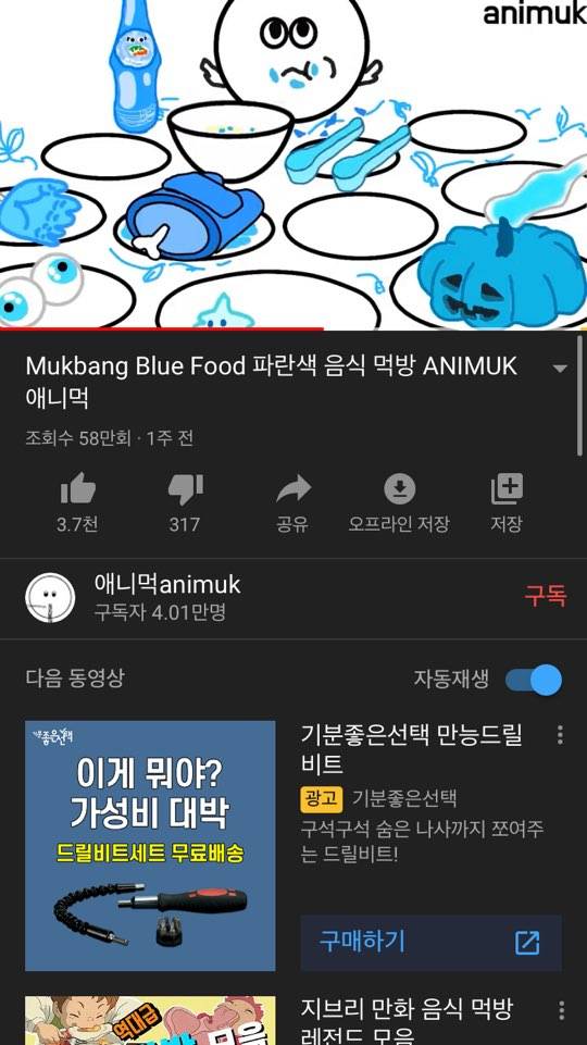 급기야 사람이나 동물처럼 살아있는 생명체가 아닌 애니메이션 캐릭터의 먹방도 주목받고 있다. 이른바 ‘애니먹’이란 유튜브 채널에 올라온 다양한 캐릭터 애니메이션 먹방 영상은 평균 50만건의 조회수를 자랑한다. 구독자도 4만명에 달한다. 애니메이션 먹방인만큼 먹는 것도 일반적이지 않다. 파란색상의 음식, ‘드래곤볼’ 등 현실에 존재하지 않는 먹부림의 향연이다.