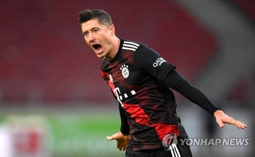epa08848895 Robert Lewandowski of Bayern Munich celebrates after scoring the 2-1 lead during the German Bundesliga soccer match between VfB Stuttgart and Bayern Munich in Stuttgart, Germany, 28 November 2020. EPA/Matthias Hangst / POOL CONDITIONS - ATTENTION: The DFL regulations prohibit any use of photographs as image sequences and/or quasi-video.