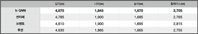 연식변경 모델인 만큼 차체 크기의 차이는 없다. 길이×너비×높이는 각각 4,675×1,845×1,670㎜. 중형급 SUV로 보기엔 살짝 작다. 크기를 한껏 키운 신형 투싼과 거의 비슷하다. 사실 QM6의 뼈대는 C세그먼트 급으로, D세그먼트 기반 중형 SUV들과는 차이가 있다. 실내 공간을 좌우할 휠베이스는 2,705㎜로 투싼이 50㎜ 길다. 참고로 경쟁 모델로 지목한 기아 쏘렌토의 길이×너비×높이는 각각 4,810×1,900×1,695㎜, 휠베이스는 2,815㎜다.