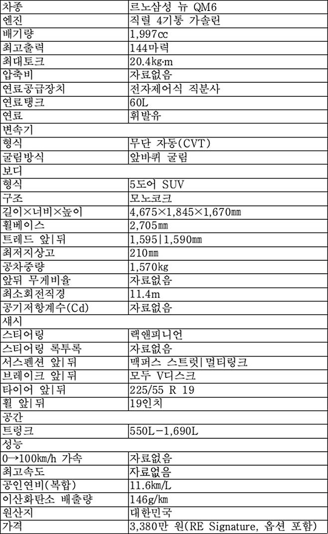 [표]르노삼성 뉴 QM6의 주요 제원