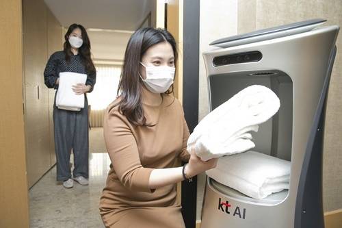 ‘로봇 버틀러’ 역할을 하는 AI 호텔로봇은 공간맵핑, 자율주행 등 첨단 ICT를 적용해 호텔 내 지정한 모든 공간을 오간다. 직원이 목적지를 설정하고 고객의 요청 물품을 배달 로봇에 넣으면, 호텔 엘리베이터와의 통신을 통해 스스로 엘리베이터를 탑승 후 층간을 이동한다. 배달 로봇이 객실 앞에 도착하면, 고객에게 도착했음을 알리고, 요청 물품을 고객이 직접 픽업할 수 있다.