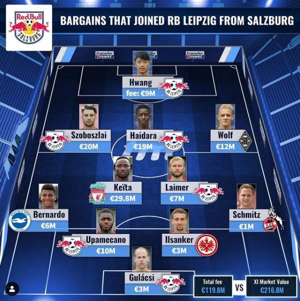 이런 상황에서 '트랜스퍼 마크트'는 잘츠부르크에서 라이프치히로 이적한 선수들로 베스트11을 선정했다. 현재 라이프치히에서 계속 뛰는 선수도 있고, 이제는 이적을 해 다른 팀에서 뛰는 선수들도 있었다.