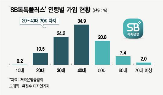 특히 ‘올드(Old)’하다는 저축은행의 금융서비스 이미지를 바꾸는 역할을 했다. SB톡톡플러스 가입 고객 중 20~40대가 70%를 차지한다. 40대가 34.9%로 가장 많았고 30대가 24.2%, 20대가 10.5%였다. 저축은행중앙회는 “간편함을 선호하는 고객 요구를 잘 반영한 결과”라고 설명했다. 물리적·기술적으로 한계가 있는 지방 저축은행들의 고객 접점도 SB톡톡플러스 덕분에 넓어졌다. SB톡톡플러스에서 신규 계좌가 가장 많이 개설된 상위 20개 저축은행 중 5개사가 지방 저축은행이었다.