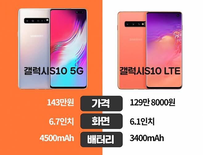 같은 제품이라도 5G폰은 LTE폰보다 더 비싸다. 지난해 출시된 ‘갤럭시S10’(512기가바이트)의 경우 5G 모델이 LTE 모델에 비해 13만2000원 더 비싸다. 최초 출고가 기준 5G 모델은 143만원, LTE 모델은 129만8000원이다.
