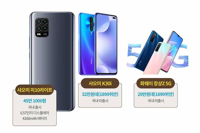 최근 화웨이·샤오미 등 중국 업체는 앞다퉈 30만원대 5G폰을 내놓고 있다. 화웨이가 출시한 5G폰 중 가장 저렴한 제품은 ‘창샹Z 5G’다. 가격은 1699위안(약 29만5000원)이다. 샤오미는 32만원대(1899위안) 5G폰 ‘홍미K30i’를 발표했다. 샤오미는 “2020년 안에 999위안(약 17만원)의 초저가 5G 스마트폰도 출시할 것”이라고 밝혔다.