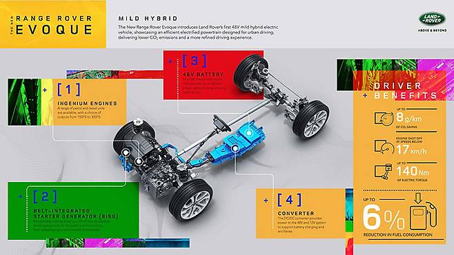 현재 판매되고 있는 48V 마일드 하이브리드는 스타터이자 발전기로 작동되는 전기모터와 비교적 적은 용량의 리튬 이온 배터리로 구성된 마일드 하이브리드 시스템이 대부분을 차지한다. 즉, 모터는 엔진 시동 외에 출발시나 가속시 구동력을 보조함으로써 엔진의 부하를 줄이는 한편, 감속시에는 그 에너지를 전기로 회수해 배터리에 저장한다. 물론 전기모터만으로 주행은 불가능하다. 이러한 48V 마일드 하이브리드 시스템을 탑재한 차량은 일반 차량보다 최대 10~20% 연비를 향상 시킬 수 있다.