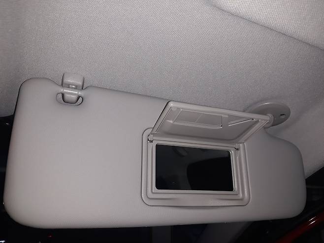 다음에는 선바이저 화장거울이다. 화장거울이 내장된 선바이저를 구매했다. 자동차 헤드라이너에 장착된 볼트를 풀어 출고 시 장착된 선바이저를 탈착했다. 새로 구매한 화장거울 내장형 선바이저는 볼트와 함께 제공돼 장착만 하면 된다. 의외로 조수석 탑승객이 가장 많이 활용하는 아이템이어서 있으면 편리하다. 개인적으로 구매하기에는 비용 부담이 크지 않지만, 제조사 입장에서는 원가 상승의 부담이 있어 기본 트림에 넣지 않았으리라 본다.