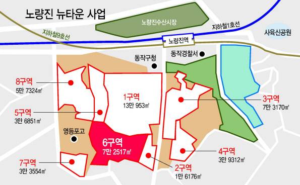 최근엔 서부선 경전철이라는 교통 호재까지 더해졌다. 총 8개의 구역으로 구성된 노량진뉴타운은 동작구 노량진동·대방동 일원의 총 73만여㎡ 면적이다. 여기엔 1·9호선 더블 역세권인 노량진역과 7호선 장승배기역이 모두 포함된다. 서부선 경전철이 장승배기역을 통과하는 것으로 결정되면서 사업 속도가 가장 빠른 6구역은 매물이 싹 사라졌다.