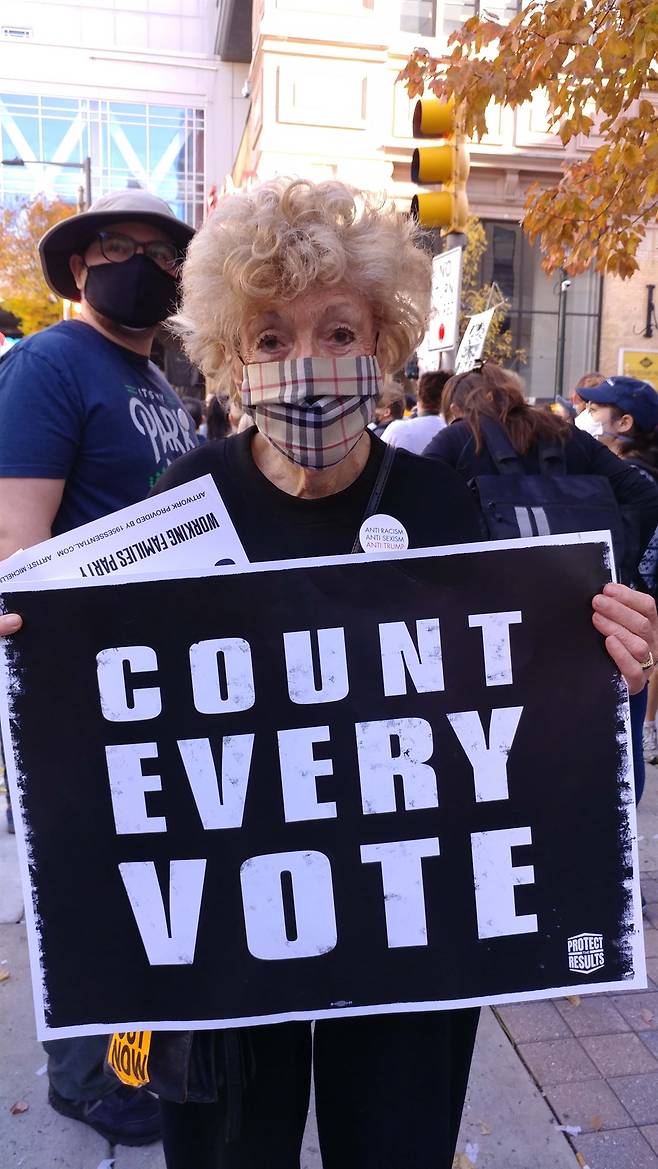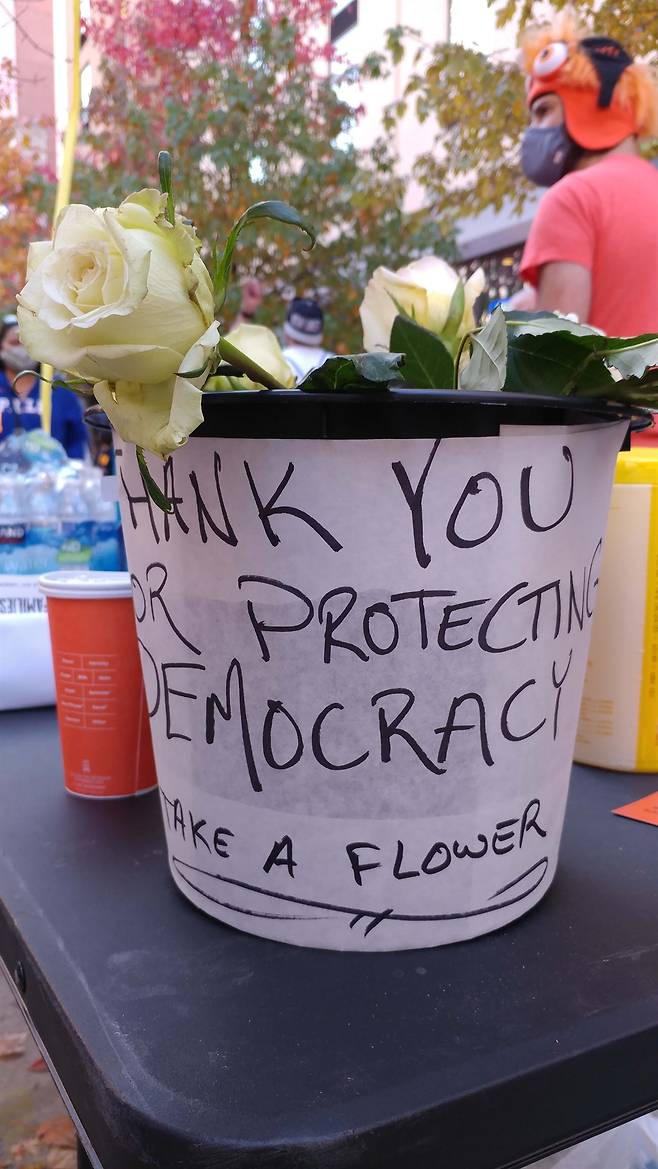 이 민주주의를 만든 사람은 누구든 가져갈 수 있도록 마련된 물과 음식, 손소독제가 하얀 장미와 함께 여기저기 놓여 있는 모습이 작은 해방구처럼 보였다. 기꺼이 주머니를 털고 벤모와 페이팔 번호를 받아 즉석에서 후원하고 인사하면서 한 목소리로 "조 바이든", "노 트럼프"를 외치고 있었다.