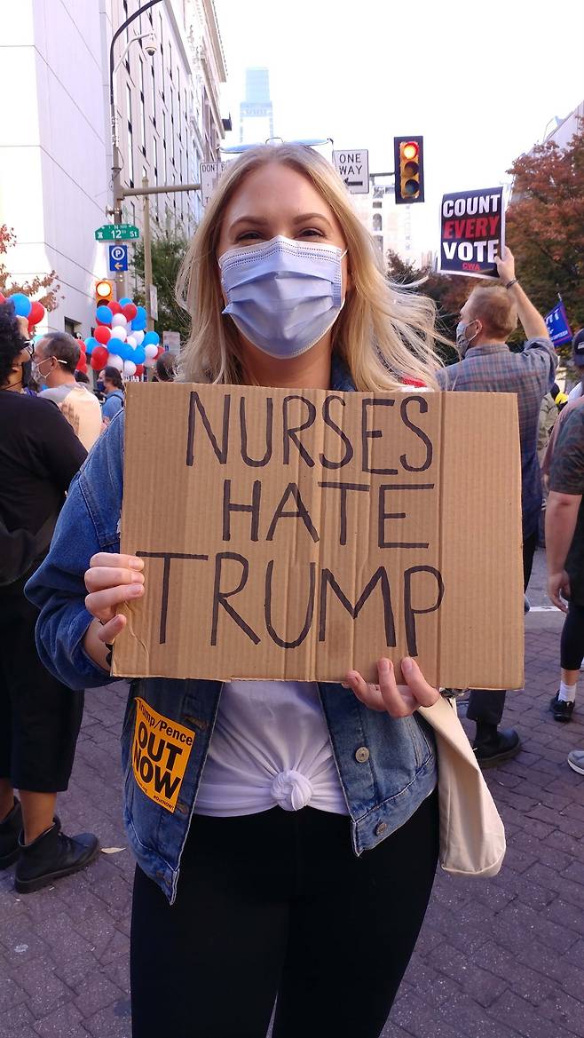 "난 간호사예요. 우리 간호사들은 트럼프를 증오합니다. 당연하죠. 코비드-19로 수많은 사람들을 병원에 실려 오게 만든 당사자고, 전선에서 생사를 다투는 우리들에게 마스크조차 제대로 공급 못한 대통령이었으니까요."