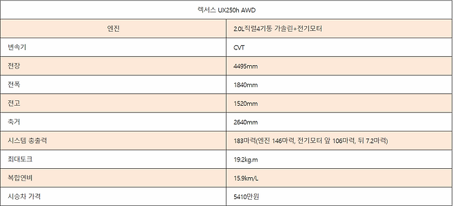 렉서스 UX는 세단의 승차감을 보유한 온로드 최적의 소형 SUV다. 실내 크기는 소형 SUV라 어쩔 수 없는 아쉬움을 남기지만, 날렵하고 스타일리쉬한 디자인과 영리한 하이브리드 파워트레인의 성능이 조화은 매력이 넘친다. 편안하지만 색다르고 세련된 SUV를 찾고 있다면 렉서스 UX250h가 합리적인 선택이 될 수 있다. AWD 가격은 5410만원.