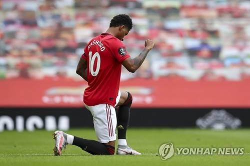 epa08560816 Marcus Rashford of Manchester United takes a knee prior to English Premier League match between Manchester United and West Ham United in Manchester, Britain, 22 July 2020. EPA/Cath Ivill/NMC/Pool EDITORIAL USE ONLY. No use with unauthorized audio, video, data, fixture lists, club/league logos or 'live' services. Online in-match use limited to 120 images, no video emulation. No use in betting, games or single club/league/player publications.
