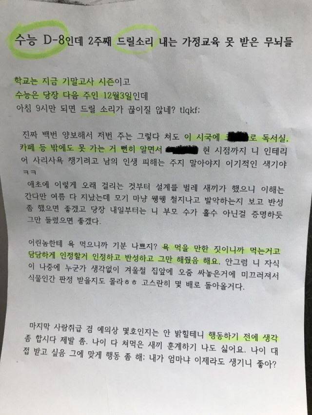 B군은 아파트 내에 ‘수능 D-8인데 2주째 드릴 소리 내는 가정교육 못 받은 무뇌들’이라는 경고문을 붙였습니다.