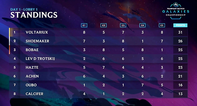4일 열린 '2020 TFT 갤럭시 글로벌 챔피언십' 1일차 A조 경기에서 한국의 '지보배' 김휘강이 25포인트로 3위 안에 이름을 올려 결승 진출에 성공했다.
