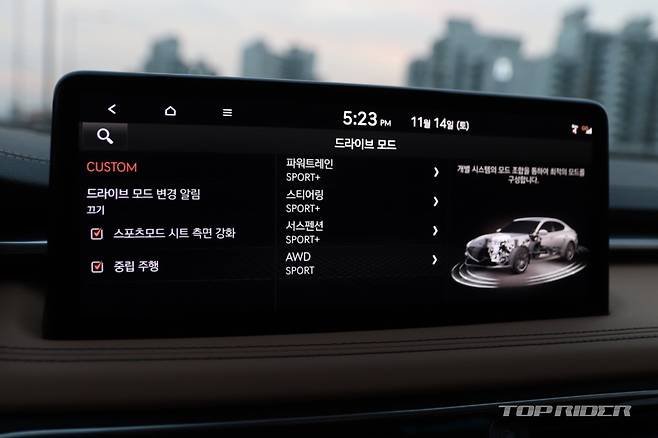 다만 자세 제어장치가 비활성화돼 주의가 필요하다. 시승은 자세 제어장치를 활성화할 수 있는 커스텀모드로 진행했다. 스포츠+는 운전자보다 더 정확하게 주행속도에 맞는 기어 단수를 매칭한다. 저속은 물론 중고속 이상에서도 한결 빠른 재가속이 가능하다.