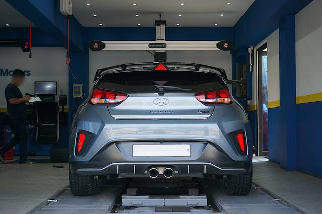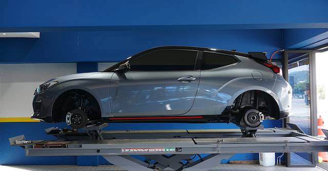 생각해보세요. 우리가 차체 무게를 올리는 건 무리가 있잖아요. 납덩이를 얹을 수도 없고 큐피디처럼 차에 생수를 싣고 다닐 수도 없는 노릇이죠. 그보다는 차라리 스프링 아래 무게를 조금이라도 덜어내는 편이 쉽다는 겁니다. 저처럼 휠 바꾸는 게 부담스럽다면 디스크 로터와 캘리퍼를 경량화하는 것도 좋습니다. LF와 JF의 관계처럼 호환되는 알루미늄 너클 또는 경량 암류가 있을 경우 그걸로 갈아주는 것도 좋아요. 참고로 벨로스터 역시 너클이 알루미늄으로 나옵니다. 역시 이 차는 팩토리 튜닝카입니다.
