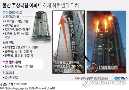 (울산=연합뉴스) 허광무 김근주 기자 = 울산 주상복합아파트에서 발생한 대형 화재가 처음 시작된 지점은 3층 야외 테라스라고 경찰이 11일 확인했다.