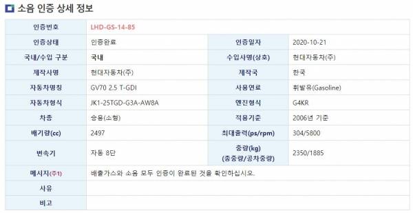 환경부 산하 국립환경과학원 교통환경연구소에 따르면, 제네시스는 지난 21일 GV70 2.5 가솔린 2WD 및 AWD와 3.5 가솔린 AWD 모델의 배출가스 및 소음 인증을 완료했다.