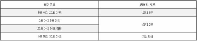 공회전 제한 시간은 대기 온도에 따라 나뉜다. 유종에 따른 기준은 동일하다. 5도 이상 25도 미만일 땐 2분, 0도 이상 5도 미만 혹은 25도 이상 30도 미만일 땐 5분, 0도 미만이거나 30도 이상일 경우는 공회전 금지법에서 자유롭다. 만약 해당 기준을 초과해 공회전을 할 경우 5만원의 과태료가 부과된다.