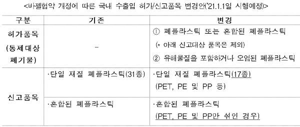 한편 국내에서는 ‘폐기물의 국가 간 이동 및 그 처리에 관한 법률’에 따라 통제 대상 폐기물을 수출입 허가품목(수출입규제폐기물)으로 관리하며 그 외 폐기물은 수출입신고 품목으로 규정하므로 개정된 바젤협약에 맞춰 국내 폐기물 수출입 허가·신고 품목도 개정된다.
