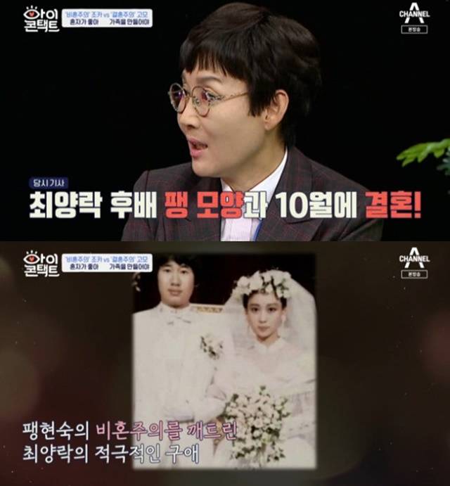 이어 "나도 비혼주의였다. 근데 남편이 10월 1일에 결혼한다고 발표해버린 거다"라며 "최양락이 기자에게 결혼 생각을 전달하며 이름을 밝히지 말아달라고 했지만 '팽모 양'이라고 뜨면서 공개열애를 하게 됐다"고 밝혔다.(사진= 채널A ‘아이콘택트’ 캡처)