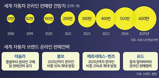 13일 글로벌 컨설팅업체 프로스트앤설리번에 따르면 지난해 전 세계에서 82만5000여대의 신차가 온라인 플랫폼을 통해 판매됐다. 이 시장은 올해 100만대를 넘어 2025년에는 600만대(약 5조원)까지 늘어날 것으로 전망된다.
