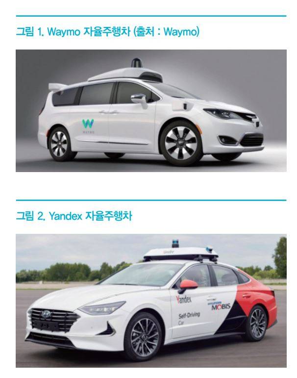 Waymo<그림 1>, Uber 등 로보택시를 목적으로 하는 자율주행 플랫폼 개발 업체들은 다수의 레이더, 카메라, 라이다 센서를 장착하고 있다. 러시아의 Yandex<그림 2>도 비슷한 구성의 센서를 이용하고 있으며 현대모비스와 협업을 통해 자율주행 플랫폼의 양산화 개발을 진행 중이다. BMW, Daimler 등 독일 제조사들은 상기 3가지 센서를 모두 사용하면서 근거리 인식을 위한 초음파 센서도 활용하고 있는 것이 특징이다. Tesla는 유일하게 라이다 센서를 사용하지 않으면서도 다소 적극적인 자율주행 컨셉을 가지고 있어서 안전성에 대한 이슈가 지속되고 있다<표 1>.