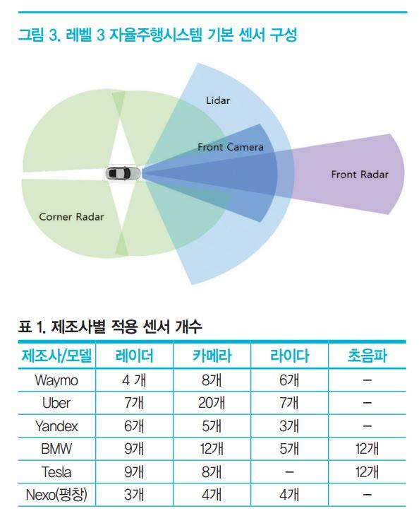 최근 주요 자동차 제조사들의 가장 높은 관심 영역은 자율주행 레벨 3 수준의 고속도로 자율주행의 양산이며, 해당 사양은 전방 및 측방 5개 레이더와 전방카메라, 전방라이다로 구성된 센서 조합을 기본으로 하여<그림 3>, 제조사들의 추가적인 센서적용을 통해 기능과 안전을 강화해 나가고 있다.