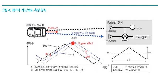 레이더는 환경에 강건하며 원거리 인식성능이 우수하며, 가격경쟁력이 우수하여 기본이 되는 센서이다. 송신안테나를 통해 송출된 전파는 차량 등의 물체에 반사되어 수신안테나를 통해 수신된다. 이 송/수신 신호의 시간/주파수 차이를 통해 거리 및 상대속도를 추정할 수 있으며 위상차를 통해 방향을 판단할 수 있다<그림 4>. 현대모비스를 비롯한 국내 개발사에서도 자체 개발품을 양산 중이며 200m 이상 검지 가능한 장거리 레이더, 160m 수준의 중거리 레이더, 80m 이하의 근거리 레이더로 구분된다. 또한, 소형화/저가화를 통해 최근에는 초음파센서를 대신하여 고성능 주차 센서로도 개발 중이며, 송수신 채널의 증대를 통해 고해상도화도 진행중이다.