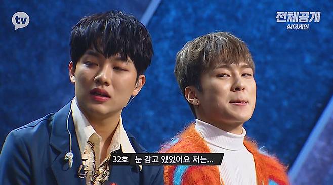 32호 가수는 1라운드에서 서로의 장점 살리기에 실패하며 5 어게인으로 합격 보류됐지만 추가 합격했다. 이후 점점 발전하는 모습으로 3라운드까지 합격. 32호 가수는 "4라운드 진출 당시 눈 감고 있었다. 너무 정신 없어서 합격 불인지 불합격 불인지 헷갈렸다"고 회상했고 위너 '베이비 베이비' 무대를 선사했다.(사진=카카오TV '싱어게인 전체공개' 캡처)