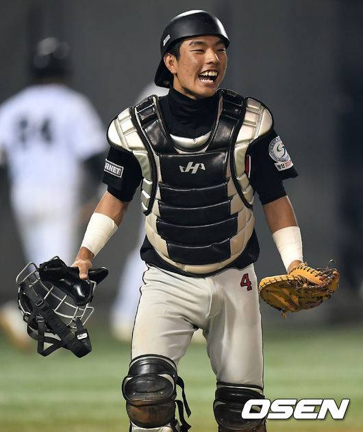 3회말 2사 2, 3루 선린인고 이기욱이 전주고 한승연의 파울 플라이 호수비를 펼친 임재민에게 환호를 보내고 있다./ksl0919@osen.co.kr
