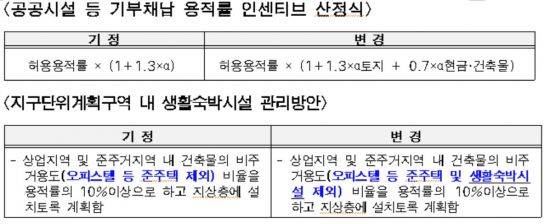 용적률 인센티브의 경우 서울시가 지난해 1월 개정한 '공공시설 등 기부채납 용적률 인센티브 운영 기준'을 신규·재정비 대상 지구단위계획구역에만 적용하지 않고 앞으로 종전 지구단위계획구역에까지 확대 적용한다. 당시 개정안 도입 배경은 총 기부채납률이 동일한 경우에도 기부채납 유형(토지·건축물·현금)별 인센티브량(건축연면적) 차이로 인한 형평성 문제가 발생해 이를 개선하기 위해서였다. 하지만 개정안 시행 전 지정된 지구단위계획구역에는 종전 기준이 그대로 적용돼 형평성 논란이 끊이지 않았다. 이에 서울시는 앞으로 관내 지구단위계획구역 302곳 전체를 대상으로 해당 기준을 일괄 적용할 방침이다.