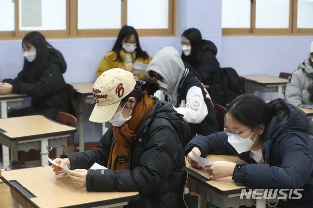 [서울=뉴시스] 사진공동취재단 = 수험생들이 23일 오전 서울 성동구 무학여자고등학교에서 2021학년도 대학수학능력시험 성적표를 확인하고 있다. 2020.12.23. photo@newsis.com