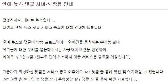 네이트는 이날 연예뉴스 페이지에서 댓글 서비스를 종료했다. 네이트 측은 지난달 30일 공지를 통해 "연예뉴스 댓글이 방송 프로그램이나 연예인을 응원하는 순기능 외에 역기능을 우려하는 사용자 의견을 반영했다"고 밝혔다.