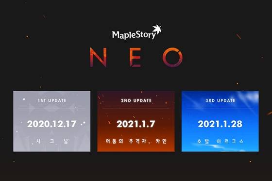 넥슨(대표 이정헌)의 인기 MMORPG ‘메이플스토리’에 대규모 겨울 업데이트 ‘네오(NEO)’가 찾아온다. 오는 17일부터 내년 1월 28일까지 세 차례에 걸쳐 적용되는 이번 업데이트는 최고레벨 확장, 신규 지역 및 보스 추가, 신규 캐릭터 ‘카인’ 등장 등이 골자다. 넥슨은 17일 ‘시그널’ 업데이트를 시작으로 내년 1월 7일 ‘어둠의 추격자, 카인’, 1월 28일 ‘호텔 아르크스’ 등을 순차 적용할 방침이다.